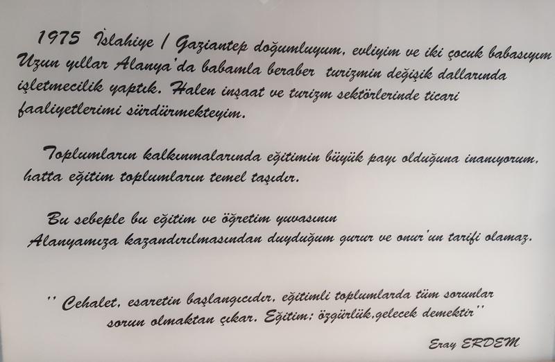 Alanya´nın hayırsever iş adamlarından Eray ERDEM tarafından yaptırılan okulumuza Eray bey ve eşinin ismi verilmiştir.
